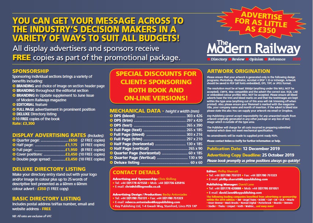 Now in it's 14th year, The Modern Railway is the definitive print and online guide to the UK Rail Industry. Published as a sister title to Modern Railways magazine, this 208 page hardback is the essential annual industry review and directory of almost 3,000 rail businesses and suppliers.